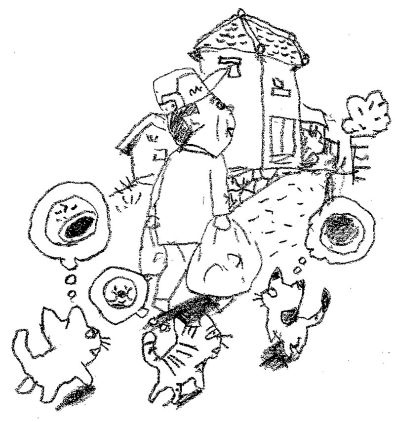 オジサンが坂道をのぼって家に帰っていくとき、ネコ 3 匹が一緒についてのぼっていく姿を竹内さんは写真に撮っています。日本の漁村のほのぼのとした光景。ネコたちのお目当てが実はアンパンだということは写真ではわかりません。