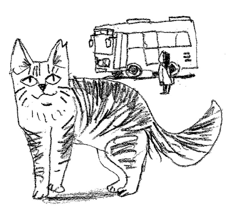 近くの電気屋のおばあさんによると「あのネコは、みんなに可愛がられておるから、ときどきお客さんと一緒にバスに乗っていくんよ」といいます。メイちゃんと呼ばれているそのネコは、みんなと一緒にバスに乗り込んでも、次のバス停で運転手さんから降ろされるので、そこから歩いてまた帰ってくるのだそうです。