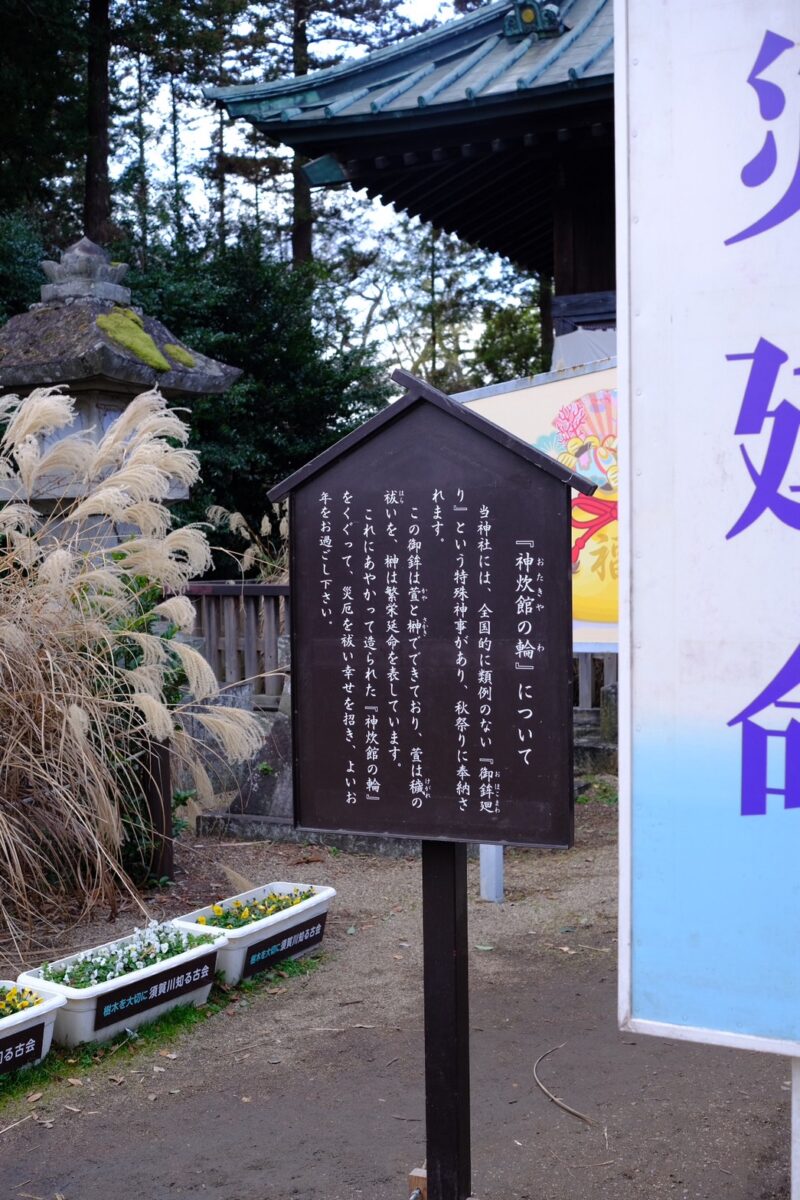 全国でも珍しい「御鉾廻り」という特殊な神事があり、かや と さかき でできた「神炊館の輪」をくぐって災厄を祓うとのこと。