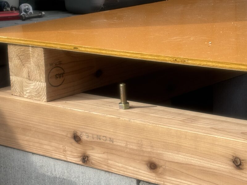 とりあえず一箇所、試しにコンクリートに穴を開けて、アンカーボルトを埋めてみました。仮の姿なので、これからモルタルでボルトとブロックを固めていきます。