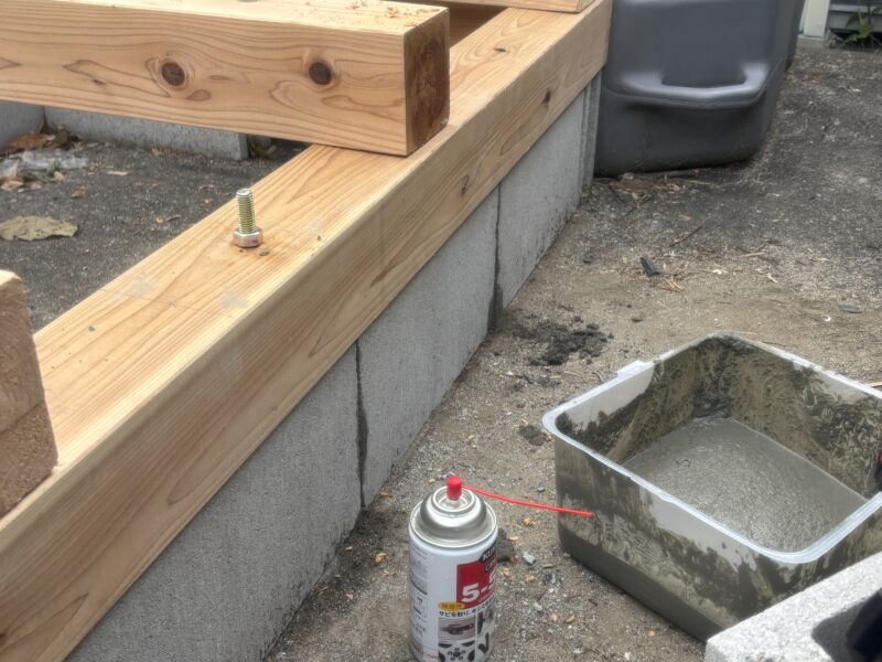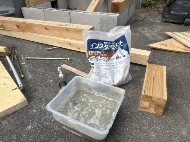 お次は、アンカーボルトとブロックをモルタルで固めます。