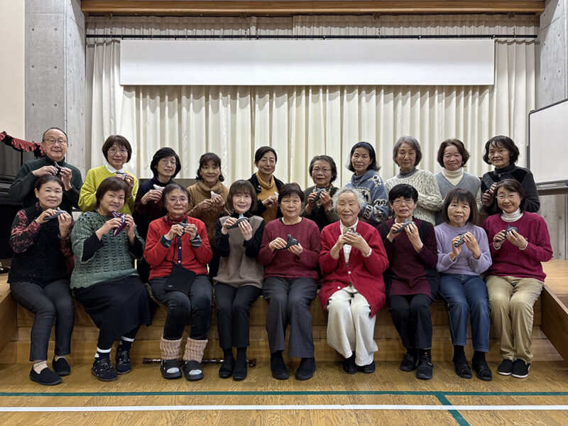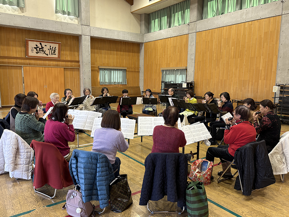 会長の飯塚久美子さんにお話を伺いました。「メンバーは、20 人で『楽しく演奏する』をモットーに活動をしています」。基本練習で音を合わせたり指の動きを確認した後、曲の練習へと続きます。今年は、10 月に開催される公民館の芸能祭、みんなでつくる音楽会に向けて、坂の上の雲の主題歌「Stand Alone」と「さよならの夏」の 2 曲をメインに練習を始めました。イベントの他にも、介護施設やデイサービスなどでボランティア演奏の活動も行っているとのことです。