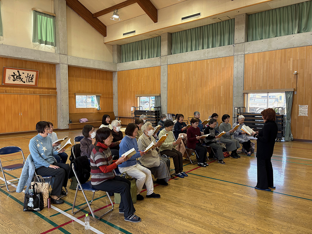 会長の栢場龍子さんにお話を伺いました。「メンバーは 60 代から 80 代の 26 人で『声を出して元気になろう』をスローガンに練習をしています」。活動は、準備体操から始まり、発声練習、イベントに向けての曲の練習と続きます。みんなでつくる音楽会、音楽フェスティヴァル、公民館の芸能祭、いきいきサロンの年 4 回のイベントに出演しているとのことです。今年度は、民謡「会津磐梯山」、NHK で放送されていたステージ 101 のテーマ曲「涙をこえて」の 2 曲を練習してきました。