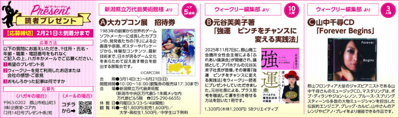 2 月 14 日号 5 ページ「読者プレゼント」につきまして、応募締切の日付に誤りがございました。